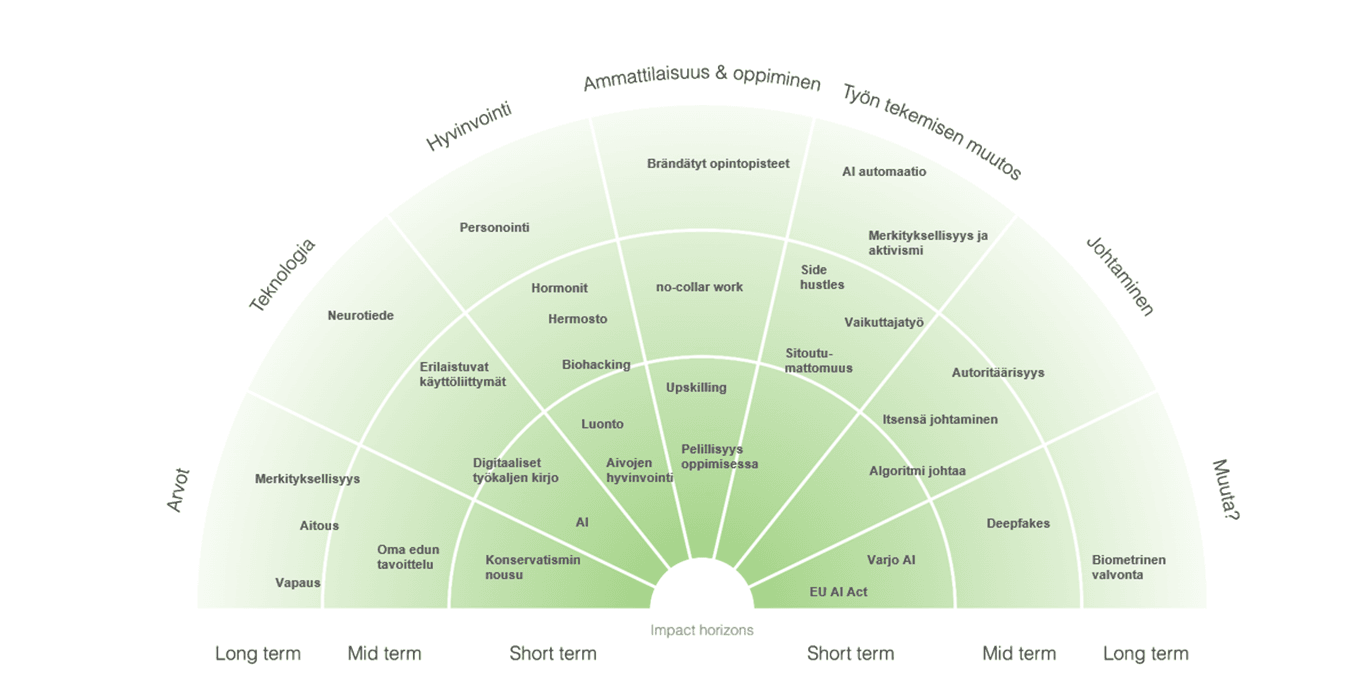 Arvot, teknologia, hyvinvointi, ammattilaisuus, oppiminen, johtaminen ja turvallisuus muovaavat tietotyö-, palvelu- ja teollisuussektoreita lyhyellä ja pitkällä aikavälillä. Muutokset eri sektoreilla tapahtuvat eri tasoissa, vaikka samankaltaisuuksia kehityssuunnissa on nähtävissä.